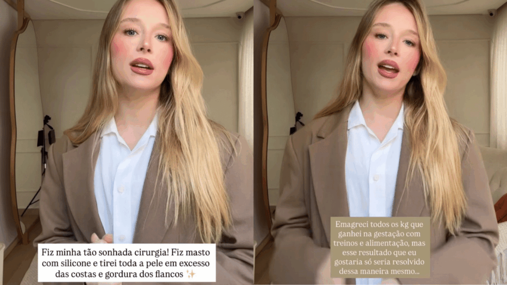 Ela revelou que, mesmo após perder o peso da gravidez, ainda se sentia incomodada. “O meu peito, para vocês terem uma noção, ele caiu 10 centímetros. E quando eu puxava meu peito, vinha pele até aqui. Eu estava muito insegura com isso”, desabafou.