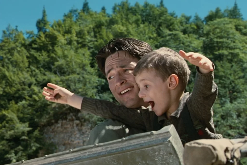 É com essa premissa — ainda que não dita em voz alta — que o enredo alegórico de “A Vida É Bela” se constrói. Guido Orefice, com imaginação afiada e estoicismo incansável, cria para o filho uma farsa amorosa e absurda que mascara a realidade brutal da Segunda Guerra Mundial. Os nazistas são os vilões de um jogo que precisa ser vencido. O roteiro, escrito por Benigni com Vincenzo Cerami, parte de uma experiência pessoal: Luigi, pai do diretor, sobreviveu a um campo de concentração — não para negá-lo, mas para torná-lo suportável. Essa herança de ternura bruta atravessa os 116 minutos do filme, sustentando uma narrativa que alterna ingenuidade e horror com equilíbrio desconcertante.