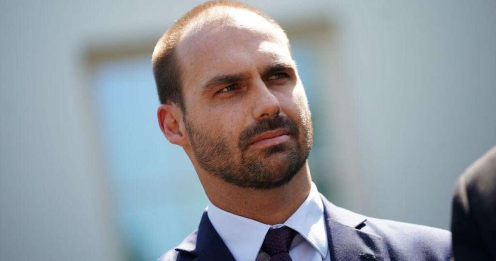 O jornal britânico acrescenta que adversários no Brasil acusam Eduardo Bolsonaro de antipatriotismo e que sua campanha provocou as tarifas que prejudicarão as exportações e levarão à perda de empregos.