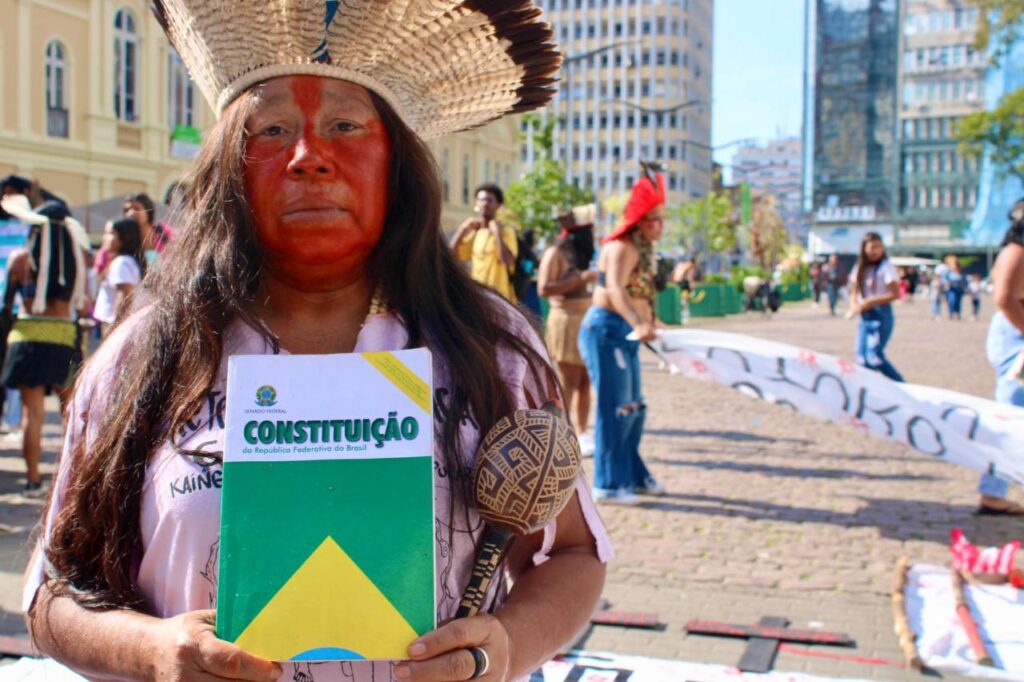 A Constituição de 1988 reconheceu o que sempre existiu para os povos indígenas e isso foi resultado de muita luta, não foi um favor. A principal lei do Brasil garante os nossos direitos originários sobre as terras que tradicionalmente ocupamos, nossa organização social, nossas línguas, culturas, modos de vida, e o dever do Estado de demarcar e proteger. O pacto constitucional existe para conter o abuso do poder e impedir que interesses privados se imponham sobre a vida. Quando o Estado relativiza esse pacto, não está “modernizando”. Está rompendo um compromisso histórico e abrindo caminho para novas formas de colonialismo e morte.